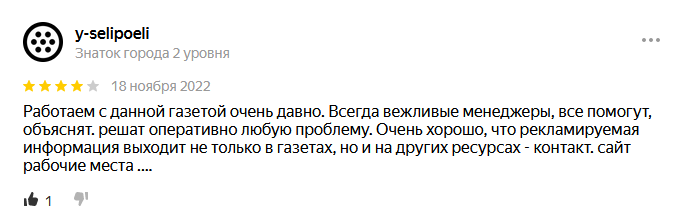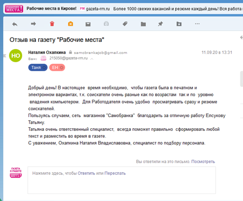 С газетой «Рабочие места» работать легко, эффективно, и очень приятно! За период сотрудничества с газетой у нас сформировались дружеские отношения. Конечно, за это огромное спасибо сотрудникам газеты, которые отзывчиво относятся к клиентам, всегда рады помочь и подойти к клиенту так, как будто он единственный, а это в современных рыночных отношениях очень важно.