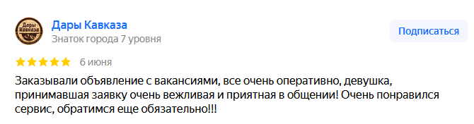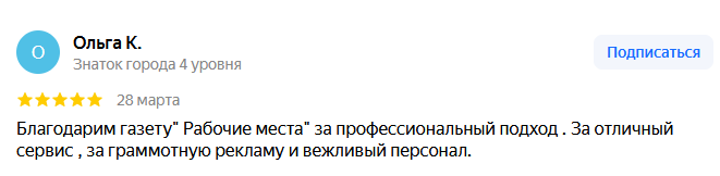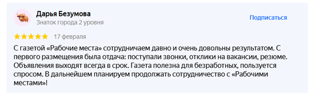 Все в г. Киров знают, что если ты в поиске работы, надежный помощник - газета «Рабочие места». И для нас, как работодателя – это неоспоримый плюс! Благодарны газете «Рабочие места» и ее сотрудникам – за своевременность, оперативность, эффективность, индивидуальный подход! Успехов!