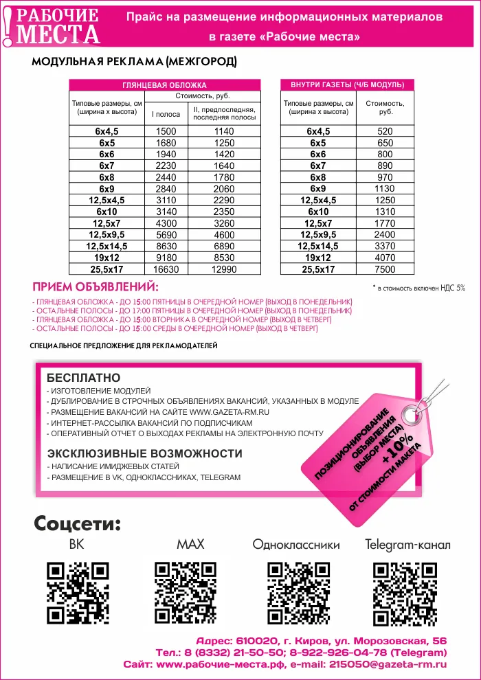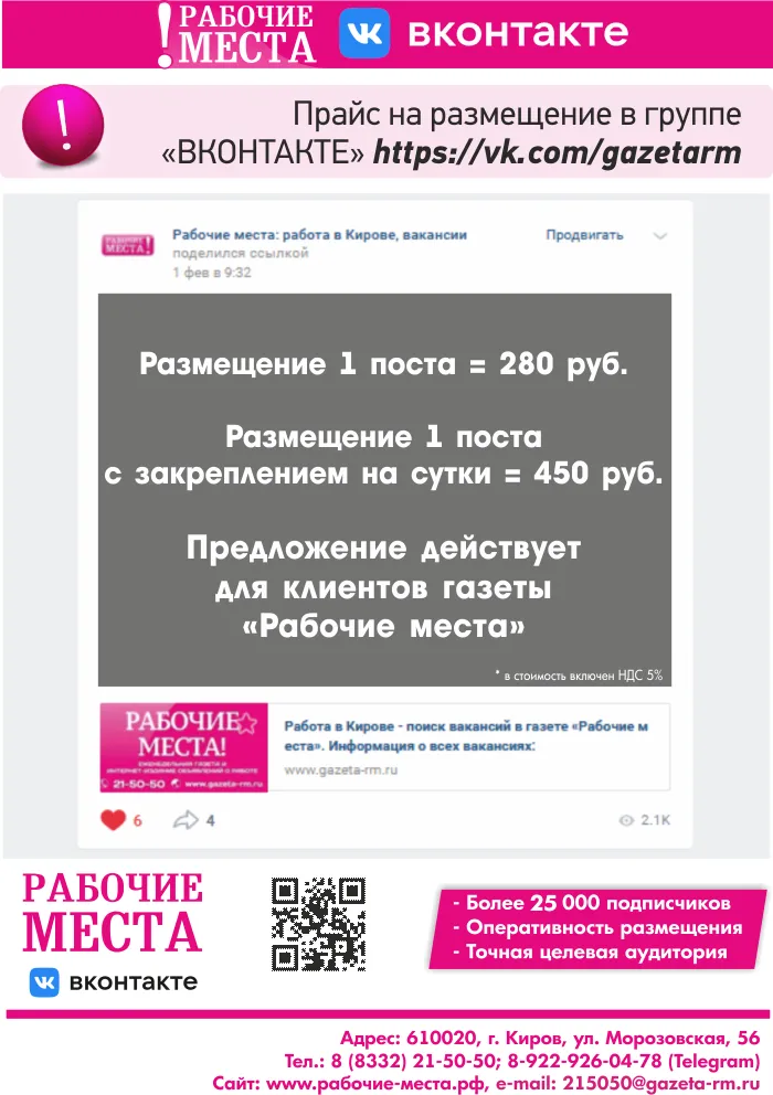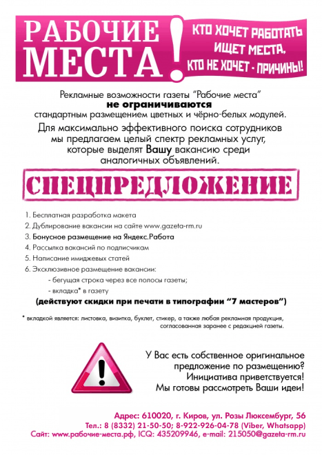 При подаче объявления в газету «Рабочие места» ваша информация одновременно будет: