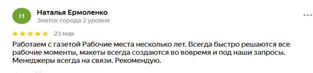 Благодарим газету «Рабочие места» за качественную работу. Особенно хочется отметить оперативность. Надеемся на долговременное плодотворное сотрудничество.