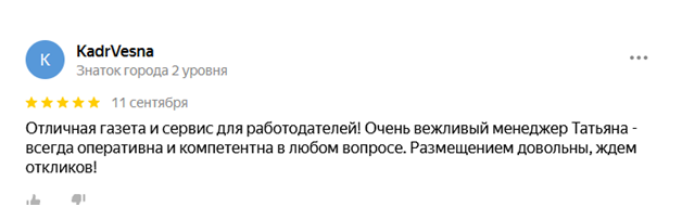 Приятно, что наши вакансии соискатели параллельно видят на сайте газеты, и это не требует дополнительных затрат. Спасибо за профессиональное сотрудничество!